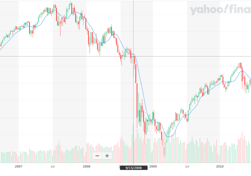 2008年9月15日,美国投行雷曼兄弟申请破产,这一日被视为金融危机全面爆发的开端。但是如果我们看标普500的股价(下图),你还会觉得危机是从9月15号开始的吗?